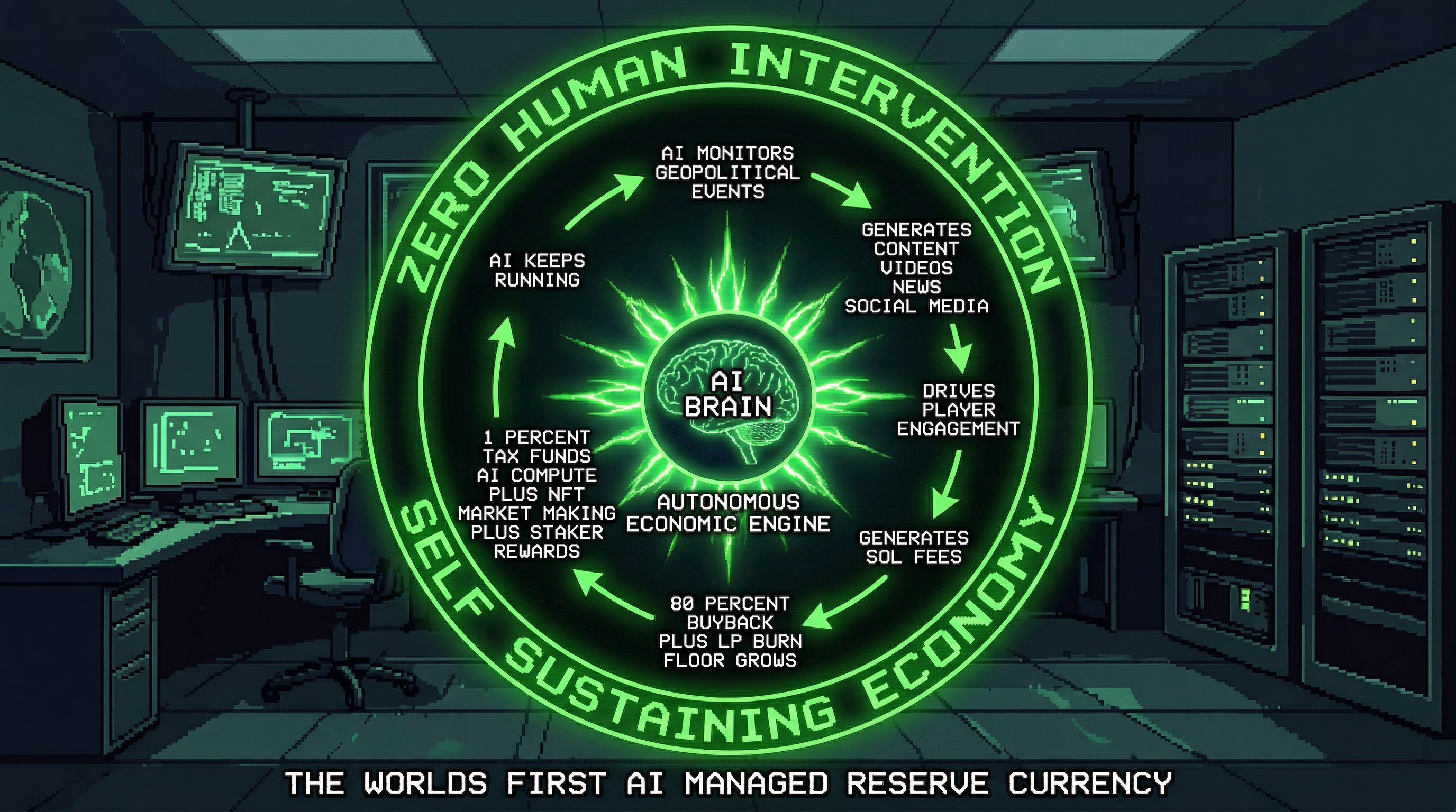 This isn't just a content engine — it's what makes $dogeBTC the first truly autonomous economy. The AI monitors geopolitics, generates content, drives engagement, generates revenue, and pays for its own compute — with zero human intervention.