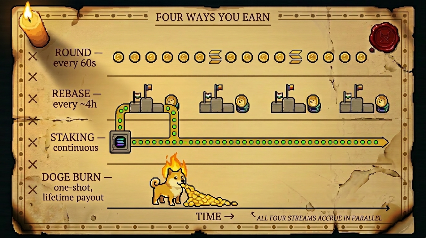 Four ways to earn: rounds pay every 60 seconds, mining wars pay every cycle (~4h), staking pays continuously, and your gameplay doge builds a dogeBTC bag over its life that you cash out by burning it.