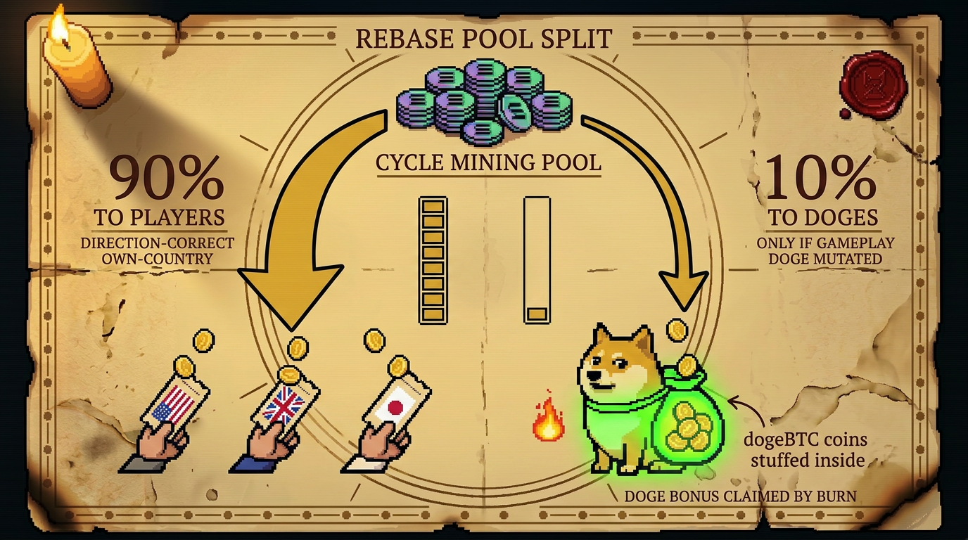 The cycle mining pool is the total dogeBTC mined across every round in the cycle. Each country's slice scales with how much was bet in its winning direction — popular countries get a bigger piece; the right call on an unpopular country pays a much bigger per-SOL return.