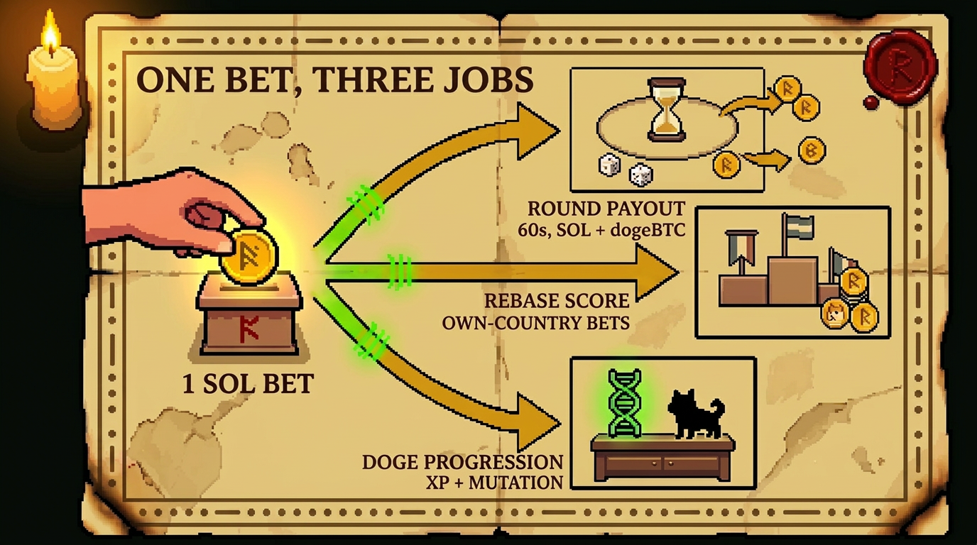 Only countries that actually got bets are eligible. Bet the exact winner and you split the SOL prize pot plus the main dogeBTC winner pool. Get the country right but miss the direction and you still share a consolation dogeBTC pool. Every round has a 1-in-625 shot at the motherlode jackpot, paid on top of the exact winners' share.