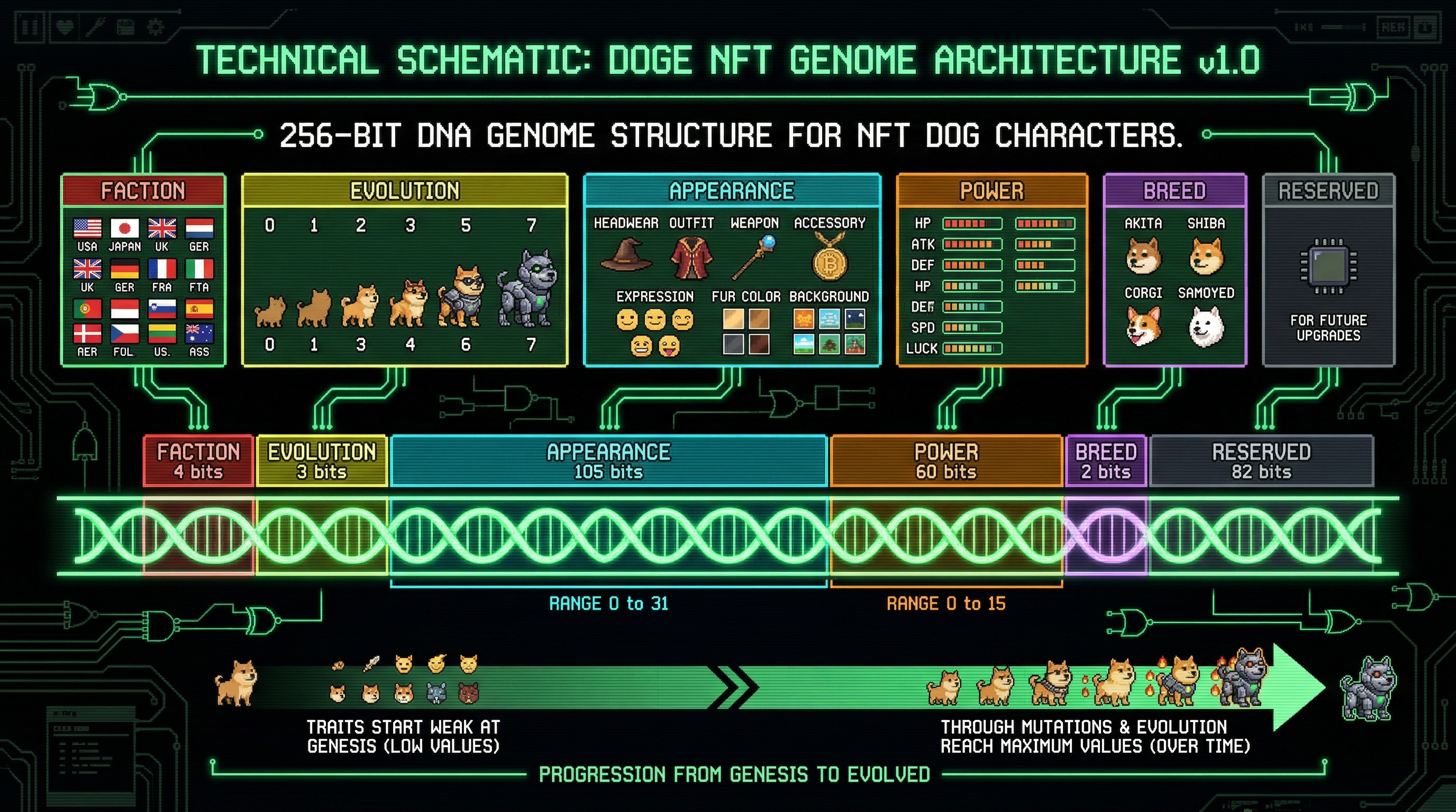 Every Bitcoin Doge is generated from a unique 256-bit (32 byte) Genetic Hash stored entirely on-chain. This code determines their visual identity, gameplay stats, and breeding potential.