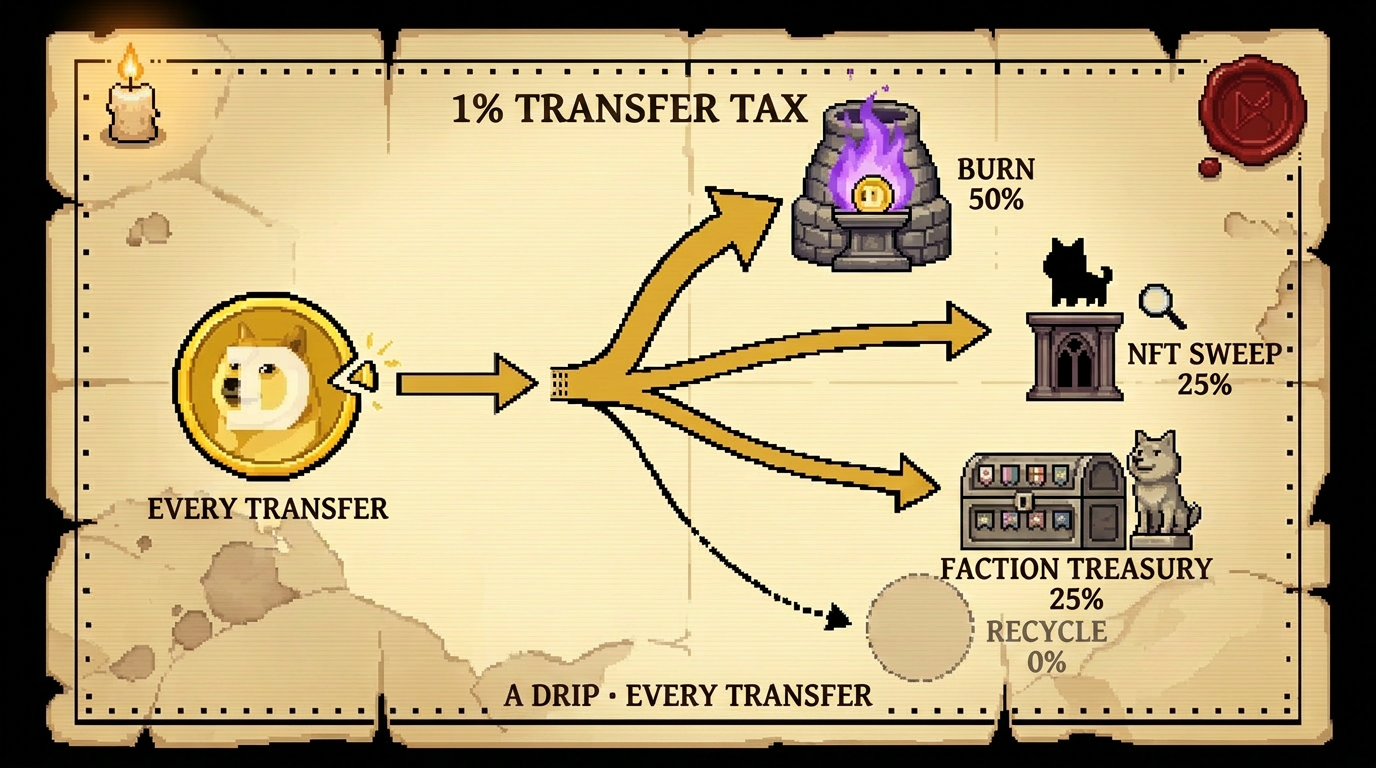 Every dogeBTC transfer pays a 1% tax, enforced at the token level. It routes between burns, your country's treasury, and an NFT floor sweep.